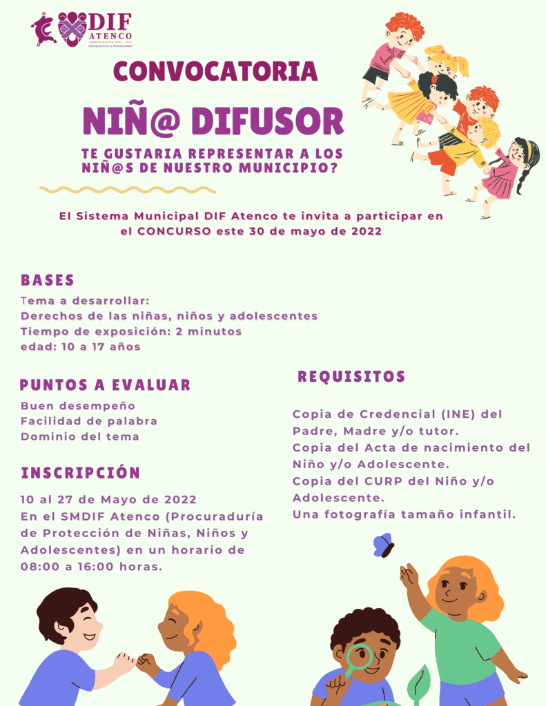 ¡Aún es tiempo se amplía el plazo para inscribirte a Concurso! El Sistema Municipal DIF Atenco a través de la Procuraduría de Protección de niñas, niños y adolescentes, invita a las niñas y los niños del Municipio de Atenco a participar en el Concurso “NIÑ@ DIFUSOR”. El concurso consiste en el desarrollo y exposición del […]